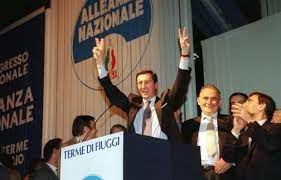 Alleanza Nazionale e il lavoro di cui certo non si potrà negare lo stacanovista zelo di Gianfranco Fini, il “normalizzatore” della Destra italiana. Operazione che consentì al movimento di inglobare associazioni minori di origine democristiana o addirittura socialista, ma anche di aprire ad alcune aree del conservatorismo liberale laico che avevano quasi sempre preso le distanze dal movimento missino e dalle sue fondazioni giudicate troppo radicali. La “svolta di Fiuggi” e la ricusazione (per la verità non troppo conclamata) delle istanze progettuali neofasciste, ma non delle radici ideologiche del movimento, la virata governista di un partito che converge verso un centro-destra conservatore e liberale. Questa la Destra che raccoglie il più ampio consenso elettorale della storia repubblicana sino a quel momento. Al suo interno muovono e prendono corpo anime distinte: una certamente missina, la seconda cattolica – conservatrice, la terza laica – liberale. La prima delle tre anime resta indubbiamente quella preponderante.